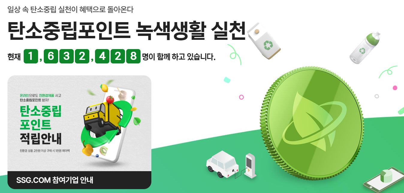 일상 속 탄소중립 실천이 혜택으로 돌아온다 탄소중립포인트 녹색생활 실천 현재 1632428명이 함께 하고 있습니다.