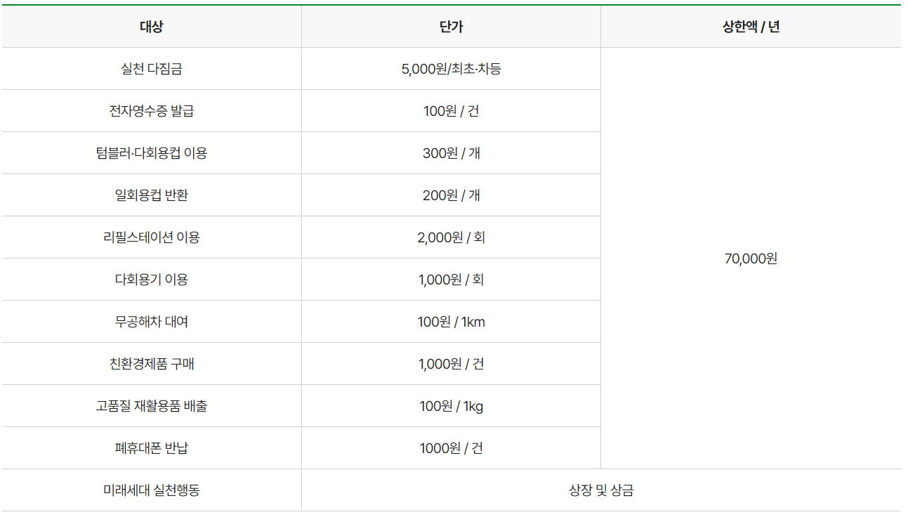 - 텀블러 대여용기 이용: 카페에서 음료를 구매할 때 텀블러를 대여하거나 개인 텀블러를 사용하는 경우 포인트가 적립됩니다.