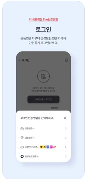 로그인 시에는 공동인증서, 금융인증서, 민간 인증서 등 총 8종의 인증 방식을 선택할 수 있어 편의성과 보안성을 모두 갖췄습니다. 주요 기능으로는 증명서 발급화면으로 곧바로 이동할 수 있는 퀵액션 기능과, 질병 위험도를 알리는 건강알람정보 위젯 설정 기능이 포함되어 있습니다. 이러한 요소들은 더 건강보험 앱을 효율적으로 사용할 수 있도록 돕습니다.
