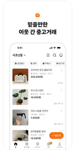 설치 후에는 간단한 회원 가입 절차를 거쳐 거래를 시작할 수 있으며, 홈 화면의 "+ 글쓰기" 버튼을 통해 물품 등록도 가능합니다. 당근마켓 중고나라 중 모바일 앱 중심 거래를 선호한다면 당근마켓이 보다 적합합니다.