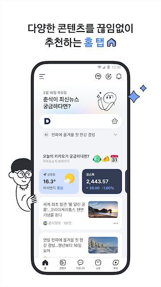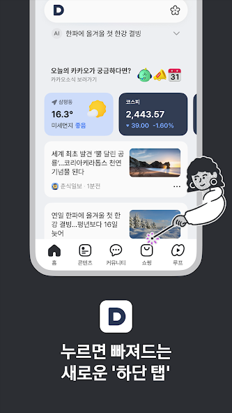 다음앱 설치 시 가장 눈에 띄는 것은 홈, 콘텐츠, 커뮤니티, 쇼핑 탭으로 구성된 직관적인 인터페이스입니다. 각 탭은 다음과 같은 기능을 중심으로 구성되어 있어 목적에 따라 빠르게 접근할 수 있습니다.